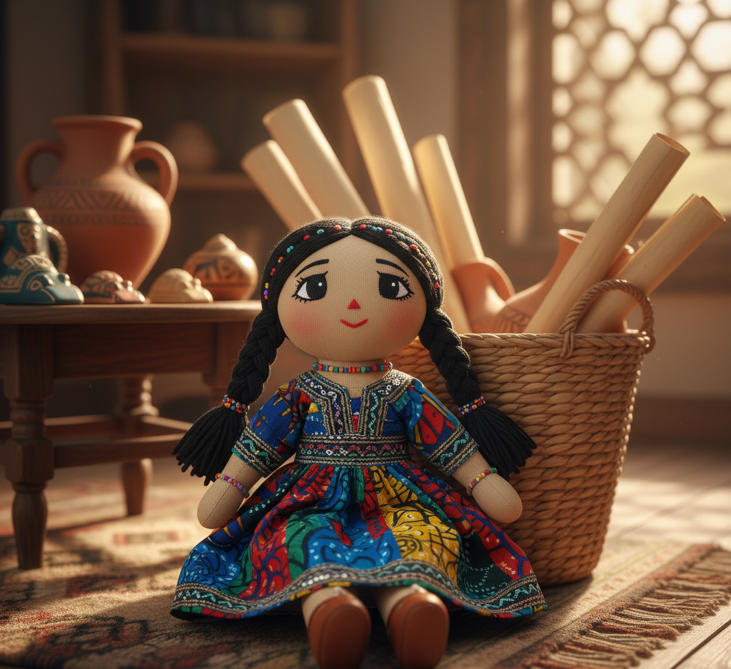 A handmade doll made from cotton materials, depicting an Egyptian girl in traditional dress, to teach children about cultural diversity and Egyptian heritage with a handcrafted touch.